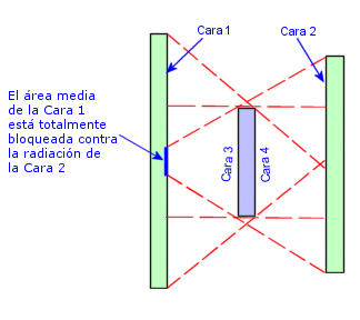 La radiación entre dos caras elementales puede bloquearse con una tercera cara elemental. En ese caso, el factor de vista se convierte en 0. El software considera automáticamente el bloqueo entre todas las caras especificadas, según se muestra en la figura. Para considerar correctamente el bloqueo, debe seleccionar las caras que participan en la radiación. En el ejemplo que aparece a continuación, las caras 3 y 4 bloquean en forma parcial la radiación entre las caras 1 y 2. Por lo tanto, si sólo selecciona las caras 1, 2 y 3, obtendrá resultados erróneos.