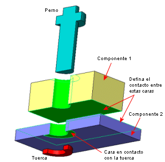 puede conectar dos componentes, varios componentes o un componente y la tierra. Puede definir pernos a través de una pila mixta de sólidos, vaciados y sólidos de chapa metálica. También puede definir un perno si selecciona entidades del mismo componente.