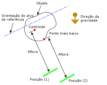 A altura especificada é a menor distância entre o corpo e o solo plano rígido. O ponto mais próximo do solo plano rígido é o primeiro ponto a atingir o solo quando o corpo se desloca na direção da gravidade.