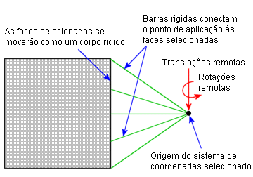O ponto de aplicação das translações (ou rotações) remotas é efetivamente conectado às faces selecionadas por barras rígidas.