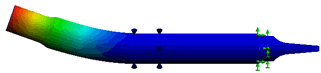 O comportamento do eixo mostrado abaixo é o mesmo para um conector de rolamento entre o eixo e o encaixe. A magnitude das tensões pode ser diferente. O acessório de fixação de rolamento considera que o encaixe é rígido e imóvel, e o conector de rolamento considera que o encaixe é flexível.