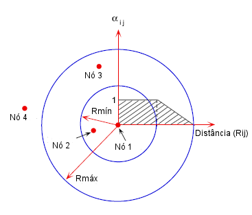 A distânciaRij está entre RMIN e RMÁX ( RMÍN < Rij < RMÁX) definidas pelo usuário. O grau de correlação é constante para RMín. menor ou igual a Rij e diminui linearmente no intervalo RMáx. - RMín.. |