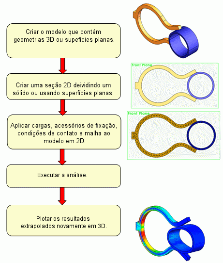 Fluxo de trabalho para a execução da Simplificação 2D Você seleciona a partir das opções de tensão plana, de deformalção plana, extrudada ou assimétrica. Após selecionar uma suposição de simplificação 2D, o fluxo de trabalho para solucionar o problema é semelhante para todas as opções. Conteúdo Definir um estudo de Simplificação 2D Você usa a opção de simplificação 2D quando define estudos do tipo estático, não linear, projeto de vaso de pressão, térmico e de projeto para modelos 3D apropriados. Seções 2D Você cria seções 2D a partir de geometrias 3D ou usa superfícies planas ou esboços no plano de seção para definir os corpos necessários para a análise. Você usa o PropertyManager de Simplificação 2D para criar a seção. Criar a seção 2D Você seleciona o tipo de opção de simplificação 2D a ser usado, cria uma seção 2D e define a profundidade da seção ou ou eixo de simetria. PropertyManager de Simplificação 2D O PropertyManager de Simplificação 2D gerencia a criação de seções 2D de geometrias 3D. Exibir resultados Depois de executar estudo de simplificação 2D, você pode plotar os resultados em 3D. Exemplos de opções de simplificação Recursos da árvore de estudos Restrições em Estudos de Simplificação 2D A configuração de uma análise de simplificação 2D é semelhante à configuração de qualquer outro estudo.