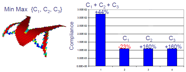 A formulação de otimização Min Max procura minimizar a conformidade máxima calculada independentemente dos casos de carga e maximizar a rigidez do componente de cada caso de carga. A forma otimizada do componente tem a rigidez máxima para cada caso de carga que pode agir de maneira independente.