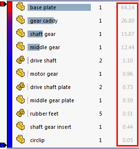 分排单属性列表 在装配体可视化中,您可以根据其自定义的属性值来排定零部件。 FeatureManager 设计树中的 装配体可视化选项卡包含装配体中所有零部件列表,该表以文件名称初始分类。 要分排清单: 单击列标题可按该属性分排零部件。例如,要按零部件质量分排,请单击质量。 再次单击可按相反顺序分排。 您可以通过双击列分隔符来调整列宽度,以适应列内容。 父主题分排清单 分排多属性列表 更改列举的属性 为列生成方程式。