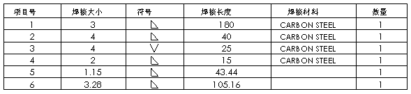 在焊接表中组合相同的焊接类型 您可在焊接表中组合相同的焊接类型。此表格可汇总焊接长度、焊接质量和各项的数量。 在焊接表中组合相同的焊接类型: 单击表格左上角的 移动表格图标,选择焊接表。 在焊接表 PropertyManager 中的选项下,选择组合相同的焊接类型。 单击 。 当焊缝数据发生更改时,焊接表也会更新。 在本范例中,执行焊接类型组合后,行 1 和 2、行 6 和 7 以及行 8 和 9 将组合在一起。行 3 和 4 不会组合在一起,因为它们属于不同的焊接类型。例如,当行 1 和 2 组合后,焊接长度为 180 (2x50 + 2x40),数量为 1。 未组合(焊缝按类型、大小和长度进行分组。) 已组合(焊缝按类型和大小进行分组。) 父主题焊接表 插入焊接表 在焊接表中添加列 在焊接表中修改列 编辑焊接表 在焊接表中添加工程图符号 保存焊接表 焊接表 PropertyManager