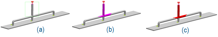 单击并拖动二维框以选择元素 (a)。 框内所有元素(可见和隐藏元素)高亮显示为紫色 (b)。 单击应用以将高亮显示的元素添加到浇道元素集,此类元素高亮显示为红色 (c)。 |