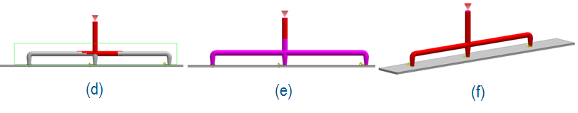 单击并拖动第二个二维框以选择更多元素 (d)。 框内所有元素(可见和隐藏元素)高亮显示为紫色 (e)。 单击应用以将高亮显示的元素添加到浇道元素集 (f)。 (单击删除以将高亮显示的元素从浇道元素集中移除。) |