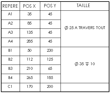 A, B, C... Utilise des labels de repère alphanumériques. Dans les repères alphanumériques, la lettre désigne une taille de perçage spécifique et le numéro une occurrence de perçage. Définissez le caractère de départ dans la zone Commencer à.