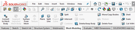 これらのツールには、CommandManager のメッシュ分割されたモデル(Mesh Modeling)タブからアクセスできます。 メッシュ分割されたモデル(Mesh Modeling)タブには、メッシュ BREP ボディで動作するメッシュ フィーチャーおよび標準フィーチャーが含まれています。