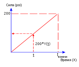 Необходимо задать пары значений X и Y или считать их из текстового файла. Значение Y кривой времени является множителем ассоциированной величины. Например, сила задана с помощью значения 200 ф/кв.дюйм, связанного с кривой времени A, как показано на кривой B. В любой момент времени (t) значение силы, примененное программой, является заданной величиной силы умноженной на значение Y кривой A во время (t). Можно определить до 5000 точек.