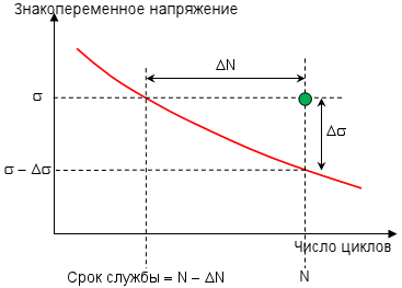 - Значение срока жизни зависит только от значения напряжения в области и кривой S-N. Он не зависит от числа циклов усталости.