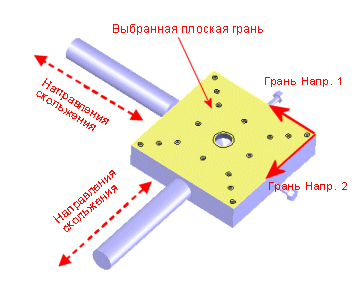 | Выбранная плоская грань (показана желтым) может скользить вдоль грани Напр. 1 и грани Напр. 2. Установка движения по нормали на ноль обеспечивает выполнение этого условия.