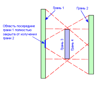 Излучение между двумя гранями может быть блокировано какой-либо гранью третьего элемента. В таком случае, коэффициент видимости становится равным 0. Программное обеспечение автоматически учитывает блокирование между всеми заданными гранями, как это показано на рисунке. Для правильного рассмотрения и учета блокирования Вам необходимо выбрать грани, принимающие участие в излучении. На нижнем примере грани 3 и 4 частично блокируют излучение между гранями 1 и 2. Неверные результаты получаются в том случае, если вы выберете только грани 1, 2 и 3.