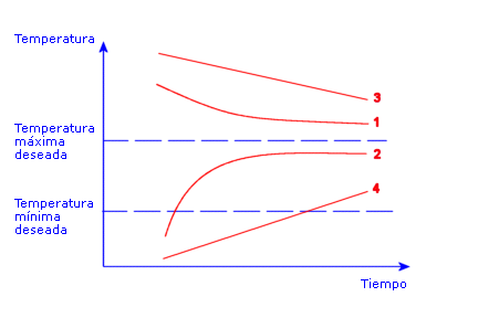 Si la temperatura en la ubicación del termostato alcanza un lado de los extremos de temperatura con una pendiente sin cruzarla (como en las curvas 3 y 4), aumente el tiempo de solución y vuelva a ejecutar el estudio.