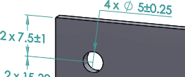 La principale différence entre Plus et moins et Géométrique réside dans la façon dont DimXpert contrôle la répétition de quatre perçages et applique les tolérances en vue de lier les éléments de référence lorsque vous êtes en mode Géométrique.