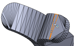 座標軸、参照軸と参照平面を追加する前に、選択フィルター ツールバーをオンにして、グラフィックス領域でファセット、ファセット フィン(エッジ)、ファセット頂点を選択します。 参照軸(Reference Axis)PropertyManager の円筒面/円錐面(Cylindrical/Conical Faces)で、選択ファセットをペイント(Paint Select Facet)または正接選択ファセット(Tangent Select Facet)を使用してファセットのグループを選択します。