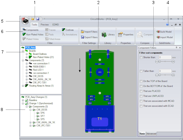 CircuitWorks 應用程式 當您從 SOLIDWORKS 開啟 ECAD 檔案時,將會出現 CircuitWorks 應用程式。 使用此介面來開啟、比較與儲存 ECAD 檔案、過濾特徵以降低複雜性、修改 ECAD 屬性,以及建立 SOLIDWORKS 零件與組合件模型。 1 QuickAccess 工具列 5 應用程式功能表 2 預覽影像 6 工具列 3 「檔案」或「屬性」面板 7 樹狀結構檢視 4 標籤層次說明 8 CircuitWorks 變更樹狀結構 (ProStep EDMD) 目錄 應用程式功能表 使用 CircuitWorks 應用程式功能表開啟及儲存 ECAD 檔案、列印預覽影像、存取 CircuitWorks 選項以及結束 CircuitWorks。 快速存取工具列 使用快速存取工具列存取您最常使用的 CircuitWorks 指令。 工具列 使用 CircuitWorks 工具列(也稱為帶狀)來存取 CircuitWorks 工具與指令。按一下工具、預覽、或 EDMD 標籤來顯示相對應的指令。 樹狀結構視圖 CircuitWorks 樹狀結構視圖是階層式的 ECAD 資料顯示。 預覽影像 CircuitWorks 預覽影像是 ECAD 資料的圖形呈現。 濾器或屬性窗格 當您檢視項次屬性或使用過濾工具時,CircuitWorks 應用程式右邊的窗格會出現。 縮放及多重選擇 您可多重選擇 CircuitWorks 樹狀結構中的項目,並顯示或編輯一般屬性。 也可以用右鍵按一下 CircuitWorks 預覽區域來存取縮放和檢視選項。