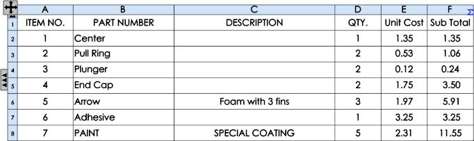 You can enter custom data in table rows. For example, you can define a row for an item that does not belong to the assembly, such as paint in a BOM.