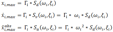 Soient les valeurs d'entrée Sd(ωI, ξI), Sv(ωI, ξI) et Sa(ωI, ξI) de la réponse spectrale qui correspondent, respectivement, au déplacement, à la pseudo-vitesse et à la pseudo-accélération. Chaque mode pouvant être idéalisé comme un système à 1 degré de liberté (SDOF), les réponses maximales sur la durée d'excitation en termes de coordonnées modales sont obtenues à partir des valeurs d'entrée de la réponse spectrale :