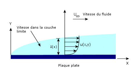 u(x,y) représente la vitesse dans la direction x. La région jusqu'au bord externe de la couche de fluide, définie comme étant égale à 99 % de la vitesse du flux libre, est appelée l'épaisseur de la couche limite de fluide δ(x).