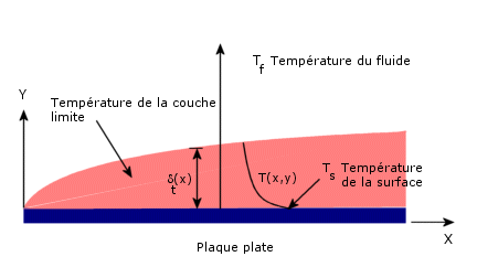 Le mécanisme actuel du transfert thermique à travers la couche limite est interprété comme étant de la conduction, dans la direction y, à travers le fluide stationnaire près de la paroi, avec un taux égal au taux de convection de la couche limite vers le fluide. La formule peut s'écrire ainsi :