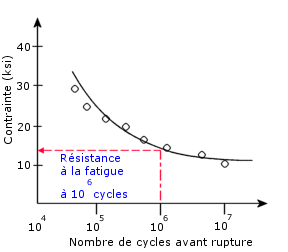 La résistance à la fatigue est déterminée par l'application de différents niveaux de contrainte cyclique à des spécimens d'essai individuels et la mesure du nombre de cycles pour entraîner une rupture. La représentation graphique de points de données de fatigue est l'amplitude de contrainte cyclique ou la contrainte alternée (S - axe vertical) par rapport au nombre de cycles pour entrainer la rupture (N - axe horizontal). La résistance à la fatigue est définie comme la contrainte à laquelle la rupture de fatigue se produit pour un nombre donné de cycles. Une courbe S-N type est présentée ci-dessous.