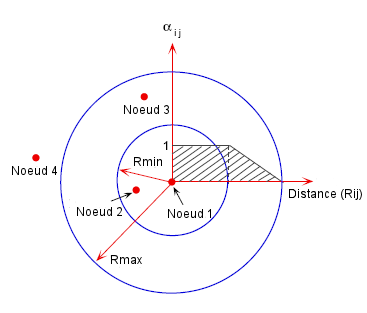 La distance Rij se trouve entre le paramètre défini par l'utilisateur RMIN et RMAX ( RMIN < Rij < RMAX). Le degré de corrélation est constant pour RMIN inférieur ou égal à Rij et il décroît linéairement pour l'intervalle RMAX - RMIN. |