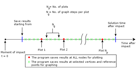 Vous pouvez visualiser les tracés de contour des contraintes, des déplacements et des déformations aux moments où le programme a enregistré les résultats à tous les emplacements. Vous pouvez également générer un diagramme de la réponse aux emplacements pré-sélectionnés (sommets et points de référence) de la résolution spécifiée. A titre d'exemple, supposons que vous définissiez le temps d'observation à 10 microsecondes, le nombre de moments pour enregistrer tous les résultats à 30 et le nombre de points du diagramme par période de tracé à 10. En admettant que le nombre de pas de simulation, décidé en interne par le solveur, soit égal voire supérieur à 300, vous pouvez générer des tracés de contour à des intervalles de 10/30 secondes, et chacun des diagrammes de réponse aura 30x10=300 points de diagramme.
