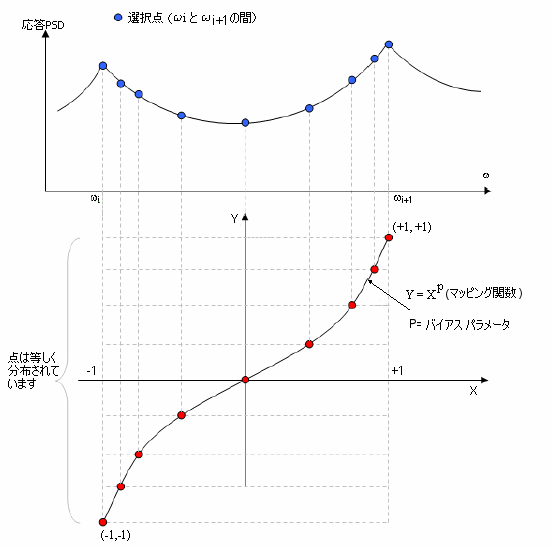 周波数点の選択(Selection of Frequency Points) 次の図では、不規則振動解析スタディで計算される解における周波数の分布が表示されています。 正規化マッピング関数は Y = XP です。ここで: P = バイアス パラメータ(累乗) Y = 指定数の周波数点数を含む均等スケール値(-1 と 1 の間) X = 正規化値(ω1 の -1 と ωi+1 の +1 に対応) 親トピック不規則振動 不規則振動 - 詳細設定(Random Vibration - Advanced) 空間相関(Spatial Correlation) 積分法(Methods of Integration)