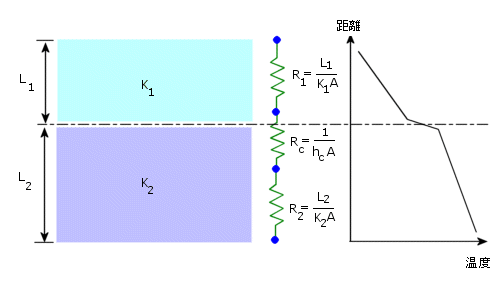 隙間) で、熱伝導率が低いために非常に効率の悪い伝導です。熱接触抵抗を処理するために、下の図のように両端の伝導媒体の間に直列に界面コンダクタンス h
