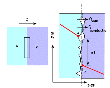 接触している 2 つの面の間の界面を通した熱伝達には、2 つの形態があります。1 つは、固体間の接触点を通した伝導 (Q