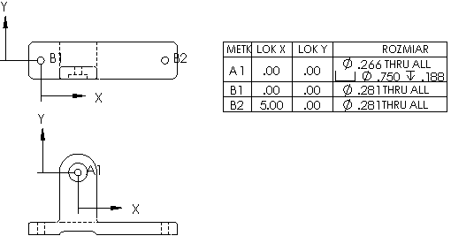 Otworów dla innego widoku rysunku. Jedna tabela otworów może zawierać kilka widoków rysunku. Tabela otworów jest dodana z jedną bazą pomiarową dla każdego widoku. Etykiety są takie same dla wszystkich widoków.