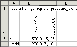 Przykład tabeli konfiguracji sterującej masą i środkiem masy: