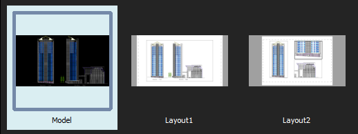 - Pré-visualização do painel. Exibe miniaturas para cada área de trabalho do desenho (folhas de modelo e layout) abaixo das guias (padrão).