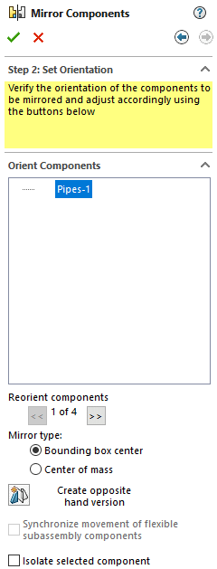 Bileşenin yerel X ve Y eksenleriyle ilgili bilgileri aynalayarak ve tersine çevirerek bileşen oryantasyonunu hesaplar. Hesaplamada X, aynalama düzlemine paralel ve Y, yüze veya Hizalama Referansı'nda seçtiğiniz düzleme diktir. Grafik alanında ikinci bir referans triadı görünür ve çekirdek ve aynalanmış bileşen için X ve Y rotasyon eksenlerini gösterir. Oryantasyon simgelerine tıkladığınızda eksenler değişir.