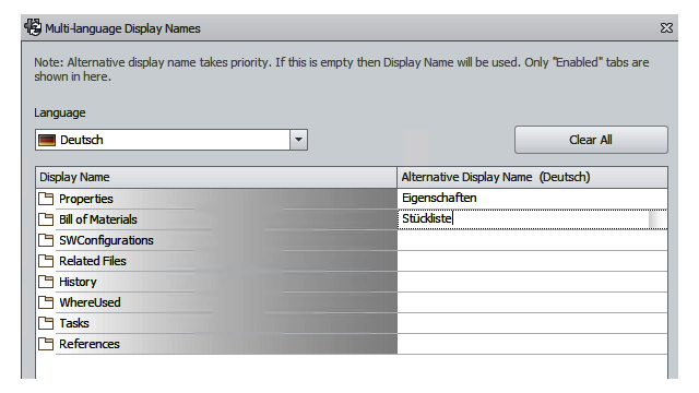 多語言顯示名稱 使用不同語言版本 SOLIDWORKS Manage 的使用者,可使用不同語言輸入文字。 文字包含欄位顯示名稱、屬性卡片標籤和模組名稱。 管理員可在「管理」工具中定義特定語言的顯示名稱。 此增強功能可讓每個使用者看到多數使用者介面以母語顯示。 上層主題SOLIDWORKS Manage