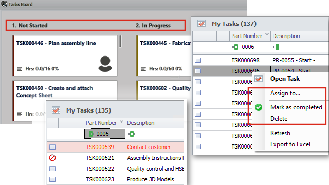• 現在可從容量規劃儀表板和我的工作區域存取「工作面板」。 您可根據優先順序和狀態分類工作群組。 您也可依主旨、開始日期、到期日、產生日期或進度進行排序。