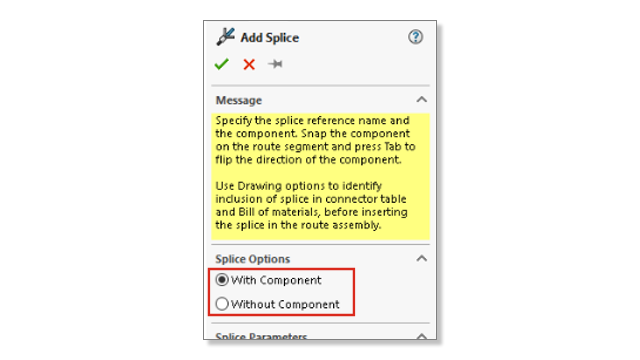 加入/編輯接合器 PropertyManager 中,您可以加入註解,以衍生至展平路線的工程圖中。 您可以選擇在電路摘要中加入接合器,以在電路摘要表中加入不含零組件的接合器。