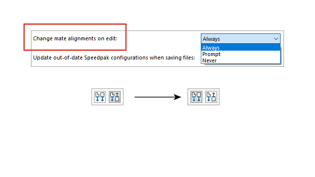 アセンブリのシステム オプションで編集時に合致整列を変更(Change mate alignments on edit)を選択すると、合致の変更により、合致の整列状態を反転することでエラーが回避できる場合に警告を出すようにします。 いつ警告を受信するかを決めるには、常時(Always)、プロンプト(Prompt)、またはなし(Never)を指定します。