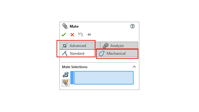 合致(Mate)PropertyManager では、標準、メカニカル、および詳細な合致タイプが別々のタブに移動されました。