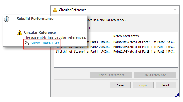 循環参照のパフォーマンス評価チェック パフォーマンス評価(Performance Evaluation)は、アセンブリの循環参照を検出します。 循環参照をチェックするには、ツール(Tools) > 評価(Evaluate) > パフォーマンス評価(Performance Evaluation)をクリックします。再構築パフォーマンス(Rebuild Performance)で、循環参照(Circular References)セクションに問題がないか確認します。 循環参照の詳細については、これらのファイルを表示(Show These Files)をクリックして、循環参照(Circular Reference)ダイアログ ボックスを開きます。 親トピックアセンブリ