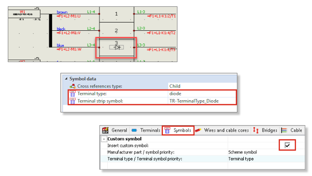 端子台のシンボル 端子図面で使用される特定の端子シンボルを、メーカー部品、または回路図で使用される端子シンボルのいずれかに関連付けることができます。 これにより、端子台図面内の端子を別の方法で表示できます。 目次 端子シンボルとメーカー部品の関連付け 端子台シンボルと端子タイプを、マネージャーに保存されているメーカー部品に関連付けることができます。 端子シンボルと回路図端子シンボルの関連付け 端子台シンボルと端子タイプを、シンボル マネージャーに保存されている端子シンボルに関連付けることができます。 端子台図面構成での特定のシンボルの使用 端子台図面で特定のシンボルを使用するには、端子台図面(Terminal Strip Drawing)構成で、カスタム シンボルを挿入(Insert custom symbol)を有効にして、そのパラメータを定義する必要があります。 親トピックSOLIDWORKS Electrical BOM からのメーカー部品の除外 Excel 自動化のアドイン ワイヤの管理 アーカイバーとスケジュール プロセス SOLIDWORKS Electrical Viewer 複数の図面の同時作成 ケーブル単位のルーティング アセンブリの生成 配線でのスプラインの使用