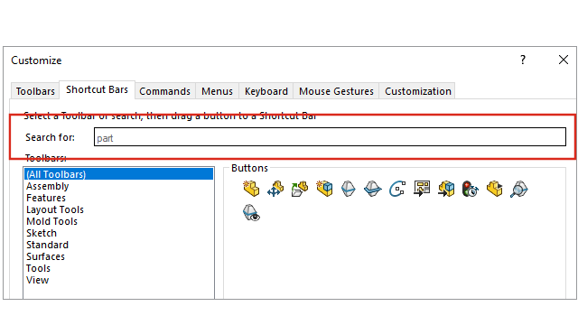 コマンドの検索 ユーザー定義(Customize) ダイアログ ボックスのショートカット バーおよびコマンド(Command)タブでコマンドを検索できます。 コマンドを検索するには、 ツール(Tools) > ユーザー定義(Customize) > ショートカット バー(Shortcut Bars) または ツール(Tools) > ユーザー定義(Customize) > カスタマイズ(Customize) をクリックし、コマンド名を入力します。 一致するコマンドがボタン(Buttons)ボックスに表示されます。 親トピックSOLIDWORKS の基礎 システム オプションおよびドキュメント プロパティの変更 色選択 翻訳されたフィーチャー名の表示 アプリケーション プログラミング インターフェイス(Application Programming Interface) その他の基本機能の拡張