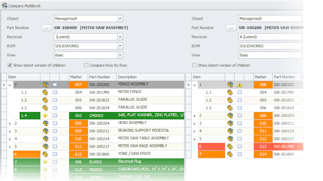 - BOM 比較ツールで複数行比較(Multi-line compare)オプションを指定することで、すべてのレベルの BOM を比較できます。