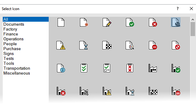 ワークフロー ステータスとトランジションのアイコン変更 SOLIDWORKS PDM には、ワークフロー ステータスとトランジションを示す新しいアイコンがあります。 既存のアイコンの色と外観が改善されました。 アドミニストレーション ツールでワークフローを開き、ステータスのプロパティ(Properties)ダイアログ ボックスで変更(Change)をクリックします。 アイコンを選択(Select Icon)ダイアログ ボックスでは、アイコンがカテゴリの下にグループ化され、選択プロセスが容易になります。 親トピックSOLIDWORKS PDM 列のカスタマイズ マスター BOM のカットリスト参照のサポート SOLIDWORKS PDM ファイル エクスプローラの機能強化 使用先タブの Treehouse ビュー SOLIDWORKS PDM のパフォーマンスの改善 参照部品参照の表示 SOLIDWORKS で定義された部品表オプションの使用