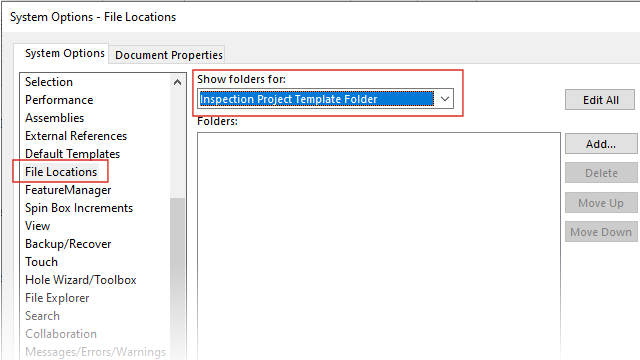 W SOLIDWORKS kliknąć i określić lokalizację pliku Folder szablonu projektu kontroli i Folder szablonu raportu z kontroli.