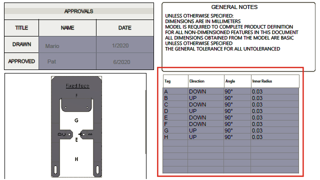 Następnie należy użyć tego szablonu podczas publikowania pliku 3D PDF dla części arkusza blachy, która ma tabelę zgięć.