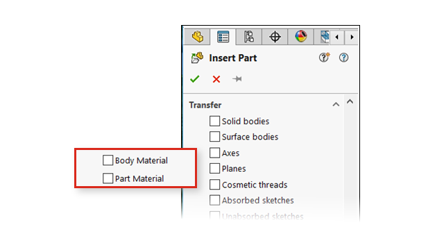 Poprzednio menedżer właściwości PropertyManager Wstaw część oferował tylko opcję Materiał do przenoszenia materiału. W przypadku lustrzanych plików starszego typu, właściwości materiału są mapowane na Materiał obiektu.
