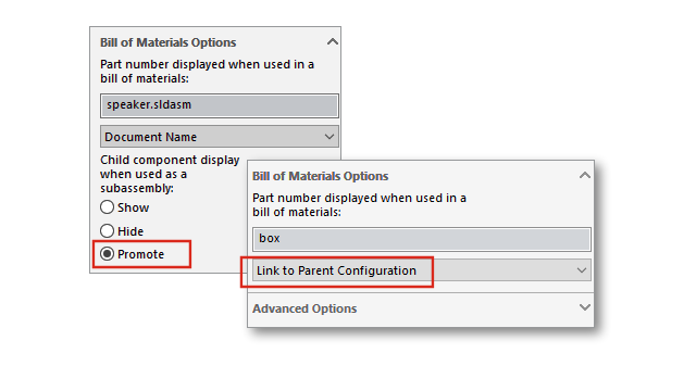 W oprogramowaniu SOLIDWORKS, w menedżerze właściwości PropertyManager Właściwości konfiguracji, parametry określone w opcjach listy materiałów są również obsługiwane w obliczonych LM w programie SOLIDWORKS PDM.